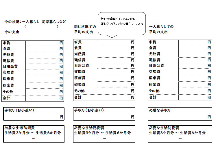 ⑦ワーク(今の支出や一人暮らしをした場合の平均の支出を記入)