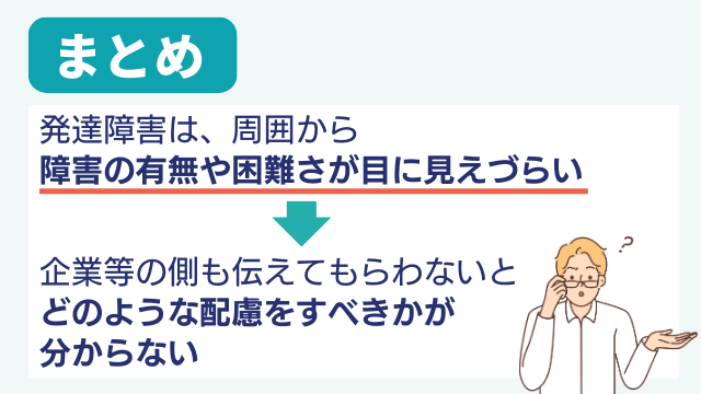 また、発達障害は「周囲から、障害の有無や困難さが目に見えづらい」ことから、企業等の側にとっても「どのような困難さを抱えているのかを伝えてもらわないと、どのような配慮をすべきかが分からない」ということがほとんどです。