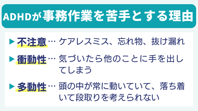 これらは、まさに「事務作業」と真っ向からぶつかってしまう特性です。優先順位を立てたり、書類を揃えたり、物事を順序だてて淡々と進めたりする「事務」は、ADHDのある方にとっては「苦手が凝縮されたジャンル」と言っても過言ではありません。