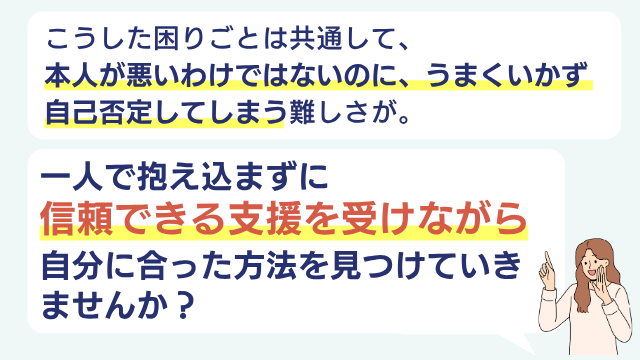 こうした困りごとには共通して、「本人が悪いわけではないのに、うまくいかずに自己否定してしまいやすい」という難しさがあります。そして、その苦しさは、一人でなんとかしようとすればするほど深まってしまうこともあります。