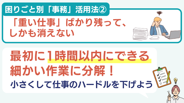 どちらも、今すぐ着手できる“等身大の作業”になります。このように「仕事の大きさをそろえる」ことで、達成感はそのままに、重い仕事にも自然と手が伸びるようになるのです。