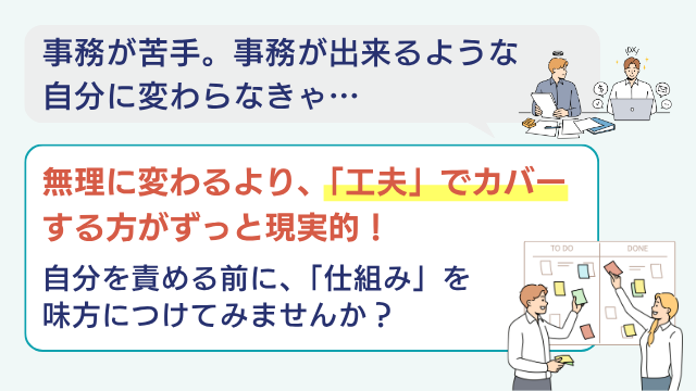 「事務が苦手。だから、事務が出来るような自分に変わらないといけない」と思っていませんか?