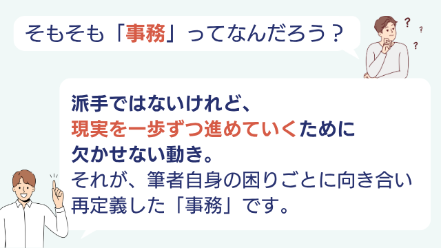 多くの方がまず思い浮かべるのは、いわゆる“事務職”の人がやる仕事内容のイメージかもしれません。 たとえば、伝票処理や資料の印刷、会議室の予約、備品の管理。そういった「オフィスの裏方」を支える業務です。一方で、筆者が自身の困りごとに向き合い、再定義した「事務」という言葉は、それを含むもっと広い意味を持っています。