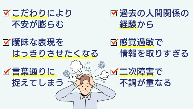 ASDがある方は、ものごとを明確に理解したいという気持ちが強い場合があります。いわゆる「白黒思考」というものです。そのため、曖昧さのある表現を理解しにくいことが多いのです。周囲からの配慮によって、ネガティブな表現を避けた遠回しなフィードバックを受けたときも、「自分のどこがどう悪かったのか」をはっきりさせたくなることがあります。