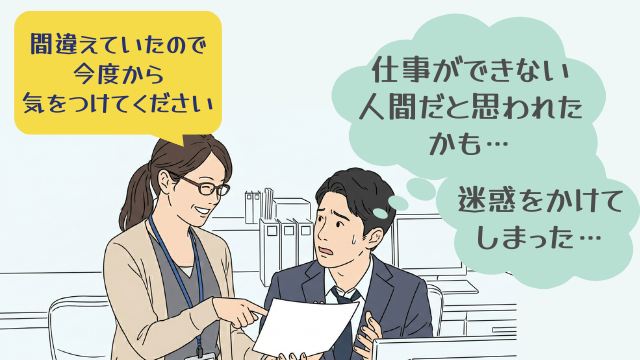 例えば、経費精算の計算を間違えたとき、「小鳥遊さん、昨日出してもらった経費精算書類、金額の合計が間違っていたから、いったん差し戻しておきました。次からは気を付けてくださいね」と、上司からとても気を遣って丁寧に言ってもらいました。しかし、それにも関わらず、「しまった。上司に不要な手間をとらせてしまった。自分は仕事ができない人間だと思われたかもしれない。」と過度に落ち込んでしまいました。