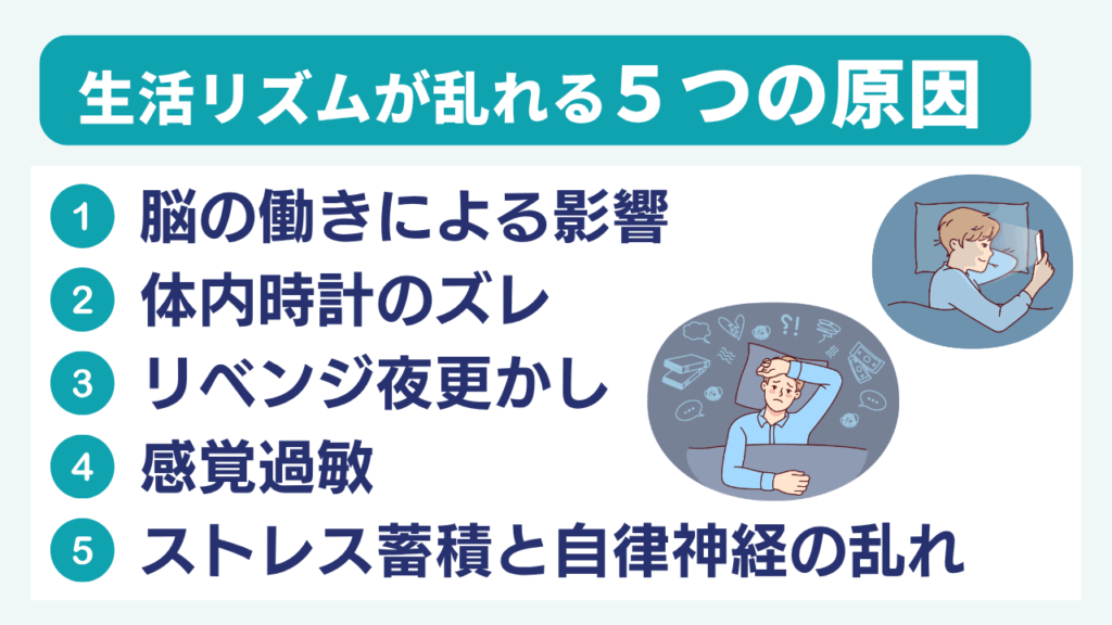 これらは、睡眠や生活リズムの「整え方」に強く影響します。つまり、同じ「生活リズムが乱れる」という困りごとであったとしても、原因となる特性は人それぞれで、特性に合わせた対策を講じる必要性があるというのが前提です。その上で、発達障害のある人によく見られる「生活リズムの乱れ」の原因を挙げていきます。