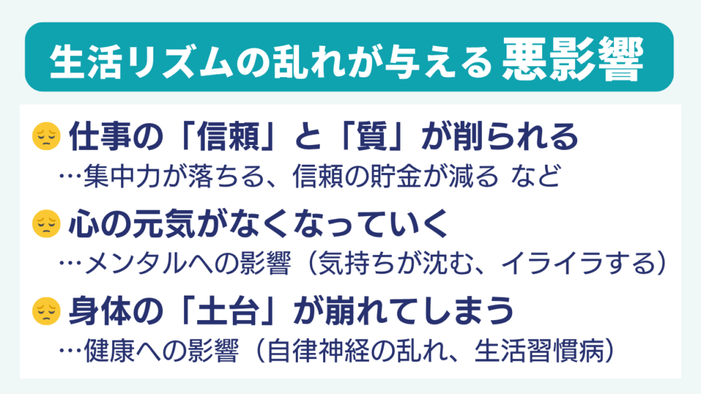 不規則な生活リズムが続くと、自覚のないまま深刻な身体的なダメージを蓄積させます。