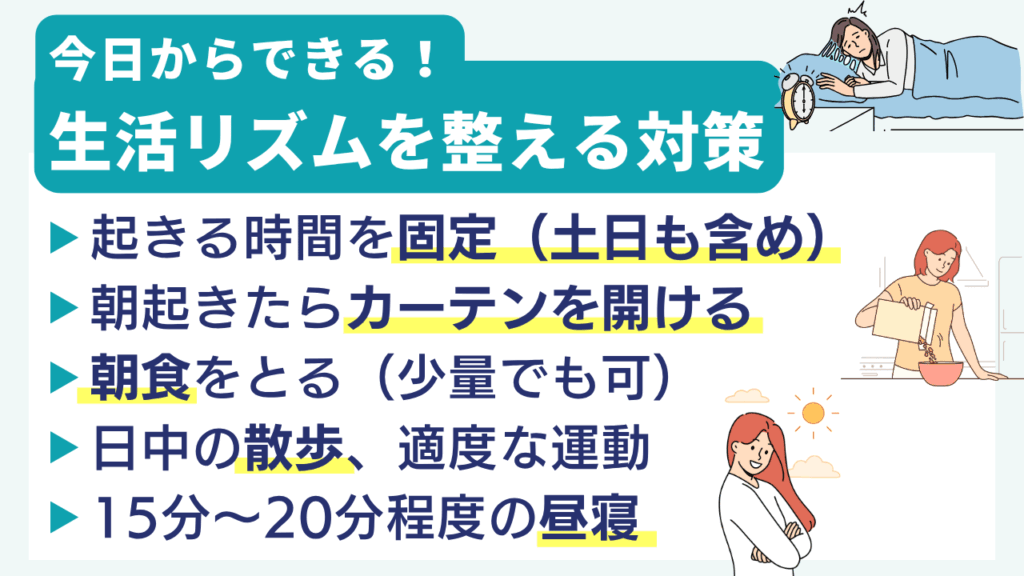 リズムを立て直すには、一度にすべてを変えようとしないことが大切です。ここは王道ですが、効果が大きい順(効果の出やすい順)に並べました。