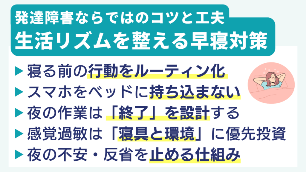 発達障害の特性のある人は、一般的な「早寝」の努力がうまくいかない場合もあります。そんなときは、以下の5つの視点を取り入れてみてください。