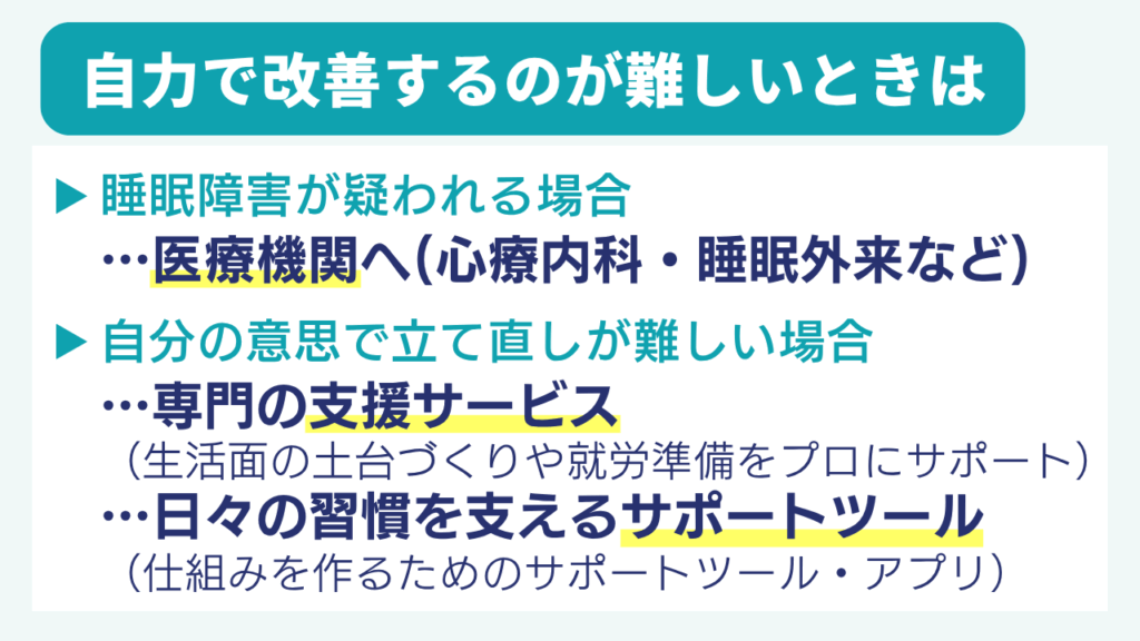 生活リズムは、自分ひとりの意志で立て直そうとするよりも、外部の「伴走」があるほうが圧倒的に安定しやすくなります。