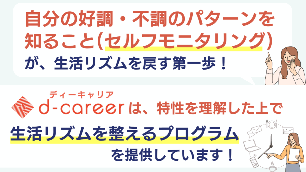 就労移行支援事業所ディーキャリアでは、セルフモニタリングの方法や生活リズムを整えるためのプログラムを提供しています。