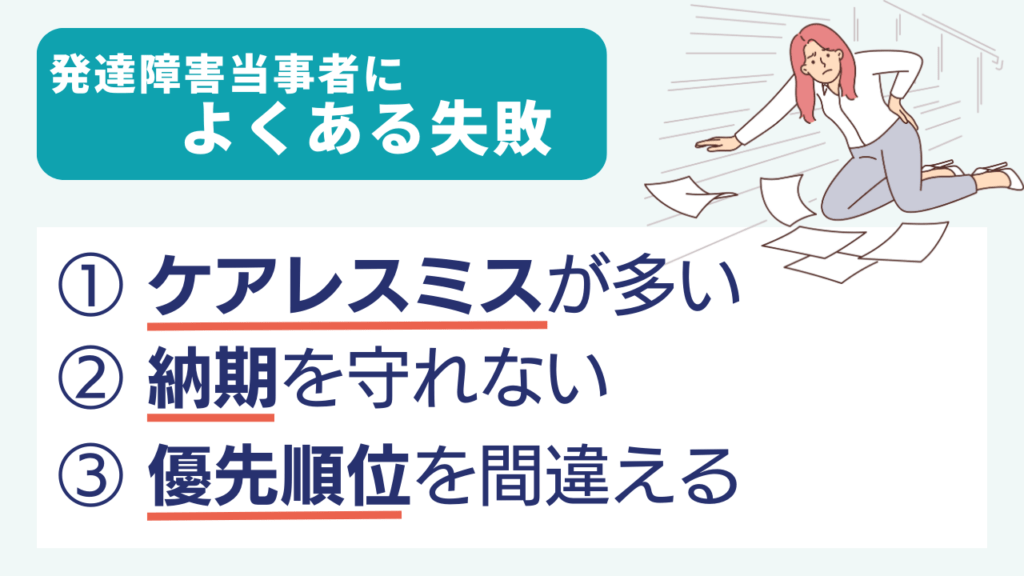 発達障害の特性があると、以下のような失敗をしがちです。それぞれについて、原因と対策を挙げてみます。