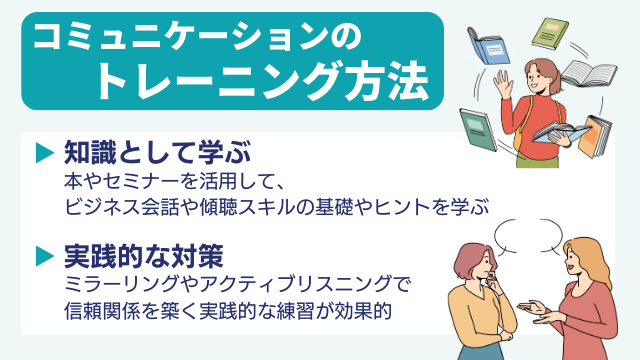 コミュニケーションスキルを向上させるためには、知識を学ぶだけでなく、実際に練習しながら身につけることも重要です。代表的な対策として、ミラーリング、アクティブリスニングといった手法があります。