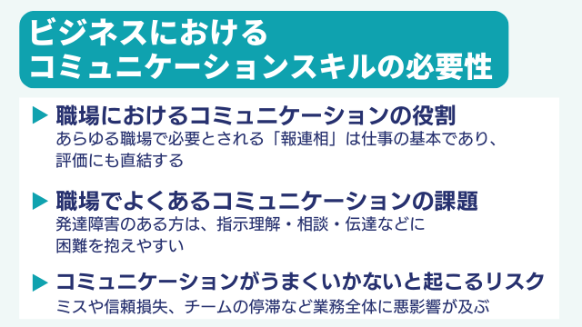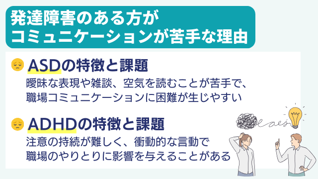 職場では、業務スキルだけでなく「コミュニケーションスキル」が求められるものです。しかし、発達障害の特性によって、雑談が苦手だったり、自分の考えを相手に伝えることや相手の意図を読み取るのが難しかったりすることで、仕事に必要なコミュニケーションが円滑にいかないことがあります。