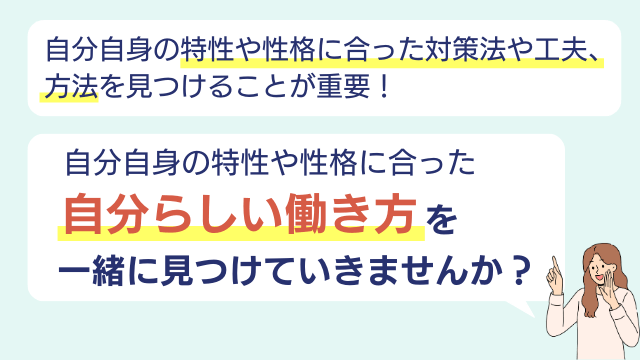 特性によって、一人ひとりに合う対策法は異なります。また、性格や働き方の好みによっても、どのような工夫が効果を発揮するかは変わってきます。そのため、自分自身に合った方法を見つけることが重要です。