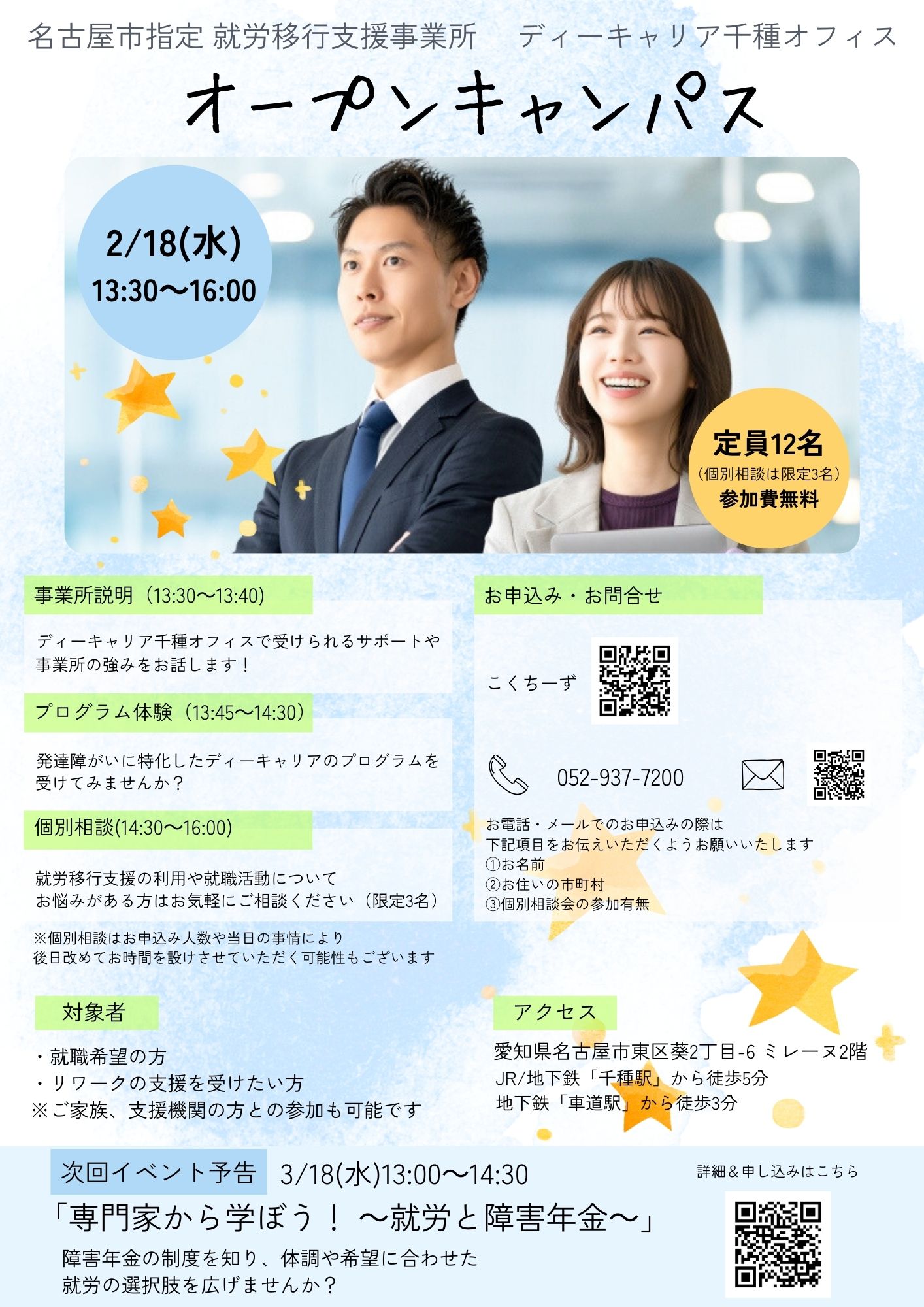 【ディーキャリア千種オフィス】02月18日(水)「オープンキャンパス」