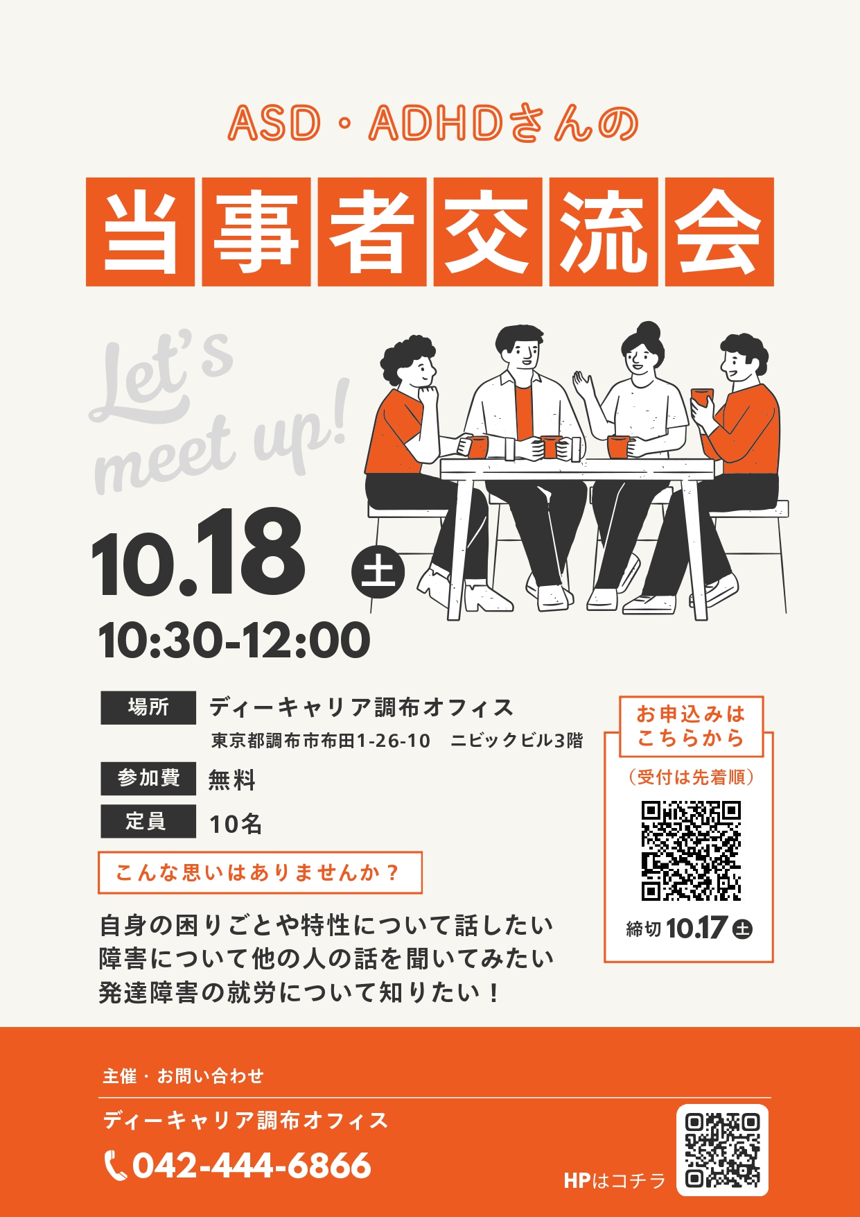 【ディーキャリア調布オフィス】10月18日(土)「ASD・ADHDさんの当事者交流会」
