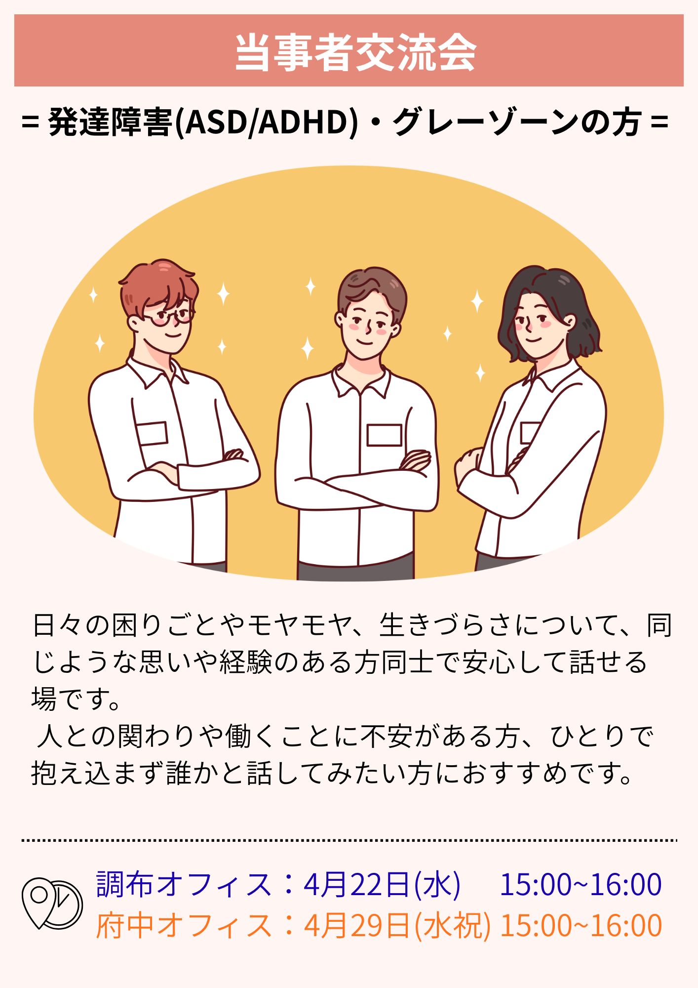 【ディーキャリア調布オフィス】4月22日(水)開催「【府中・調布エリア】発達障害(ASD/ADHD) グレーゾーンの方の当事者交流会」
