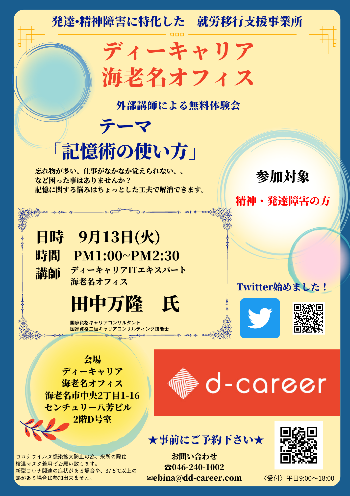 【ディーキャリア海老名オフィス】9月13日(火)「【外部講師による無料体験会】記憶術の使い方」