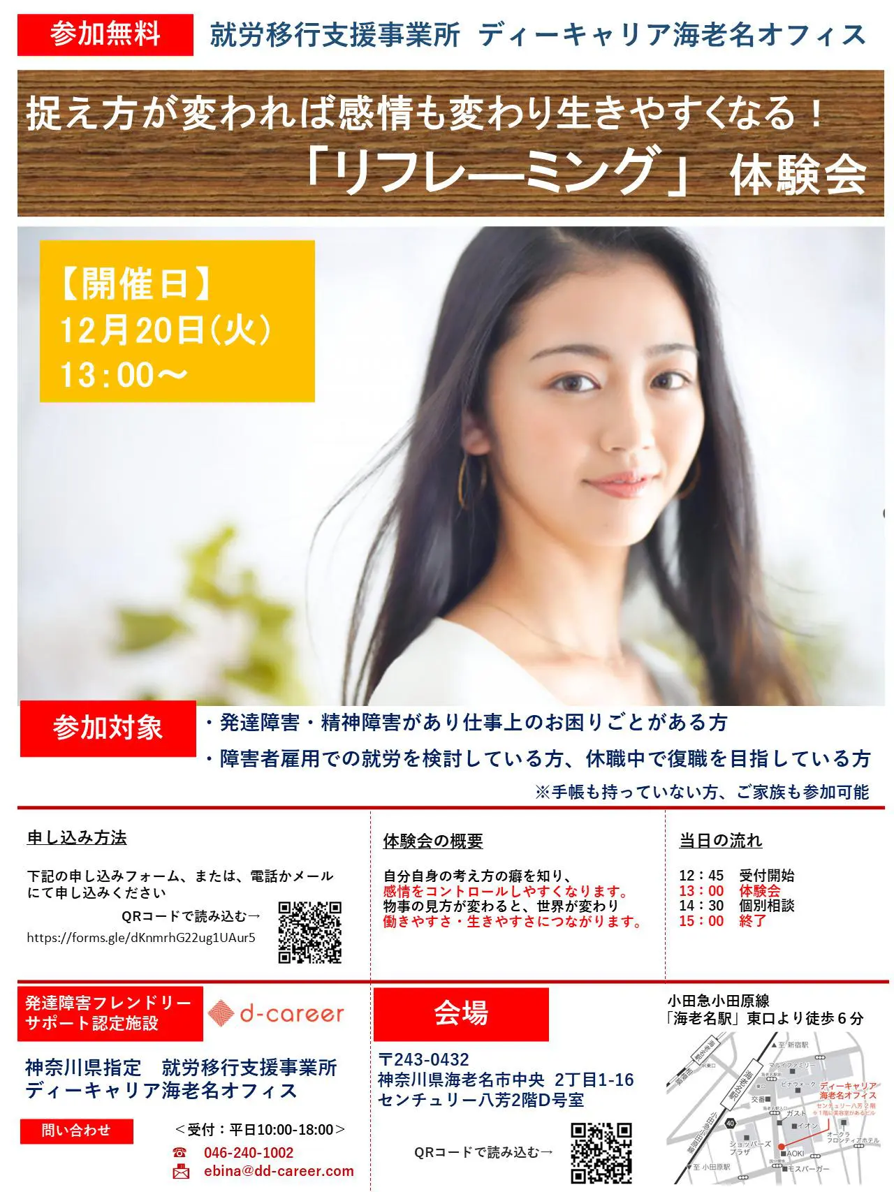 【ディーキャリア海老名オフィス】12月20日(火)開催「捉え方が変われば感情も変わり生きやすくなる!リフレーミング体験会」