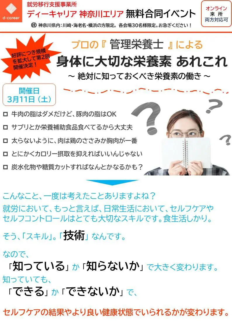 【ディーキャリア海老名オフィス】3月11日(土)開催「プロの管理栄養士による 身体に大切な栄養素のあれこれ ~絶対に知っておくべき栄養素の動き~」