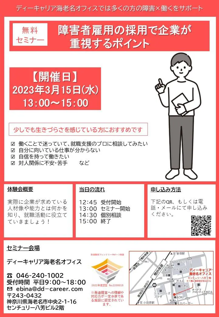 【ディーキャリア海老名オフィス】3月15日(水)開催「障害者雇用の採用で企業が重視するポイント」