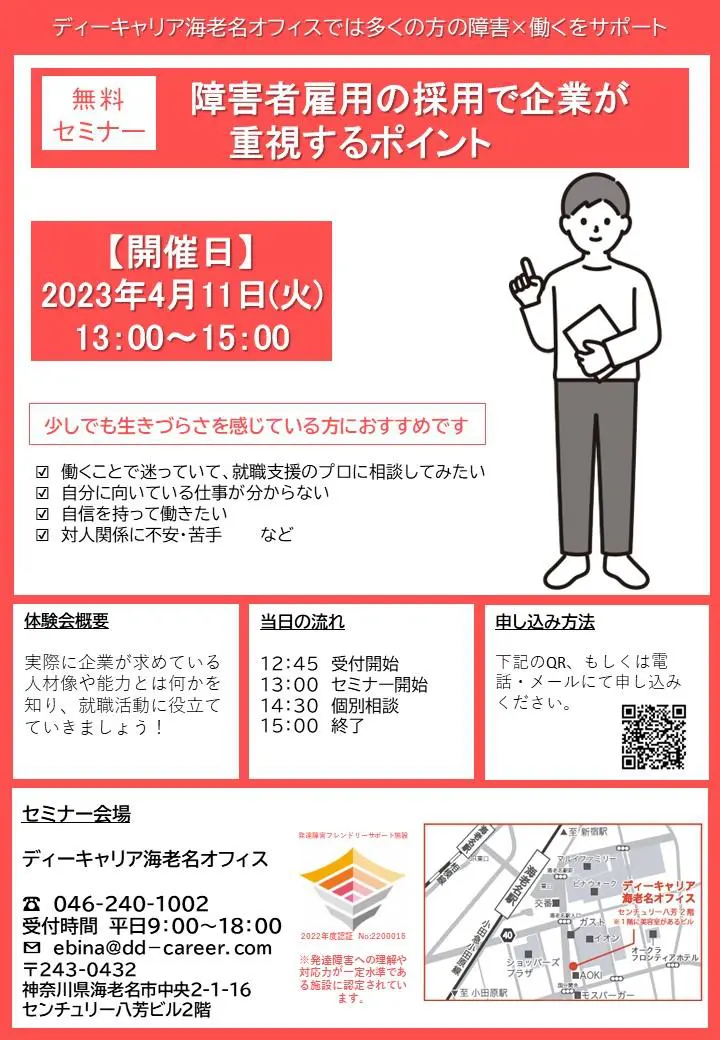 【ディーキャリア海老名オフィス】4月11日(火)開催「障害者雇用の採用で企業が重視するポイント」