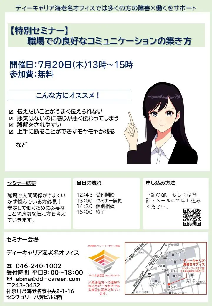 【ディーキャリア海老名オフィス】7月20日(木)開催「職場での良好なコミュニケーションの築き方」