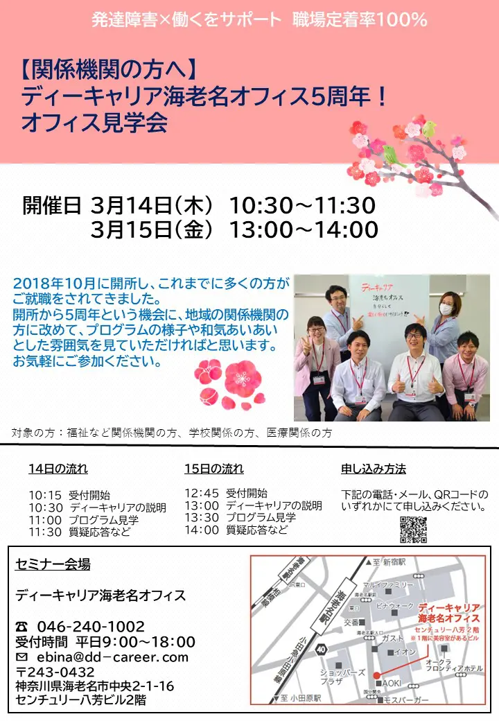 【ディーキャリア海老名オフィス】3月14日(木)・3月15日(金)「【関係機関の方向け】ディーキャリア海老名オフィス開所5周年!オフィス見学会」