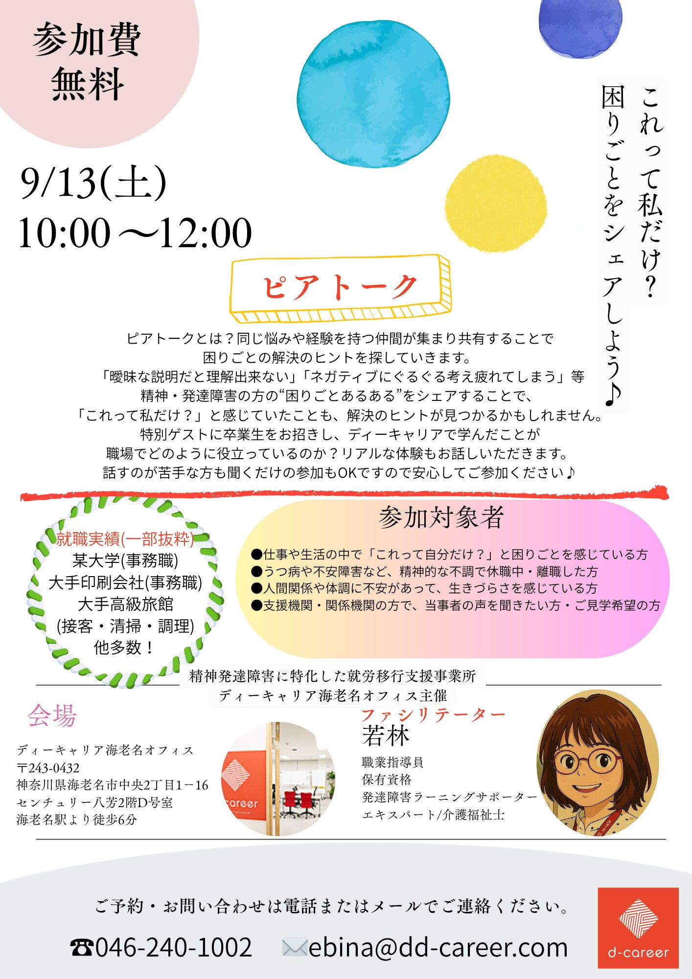 【ディーキャリア海老名オフィス】9月13日(土)開催「『これって私だけ?』困りごとをシェアしよう!ピアトーク」