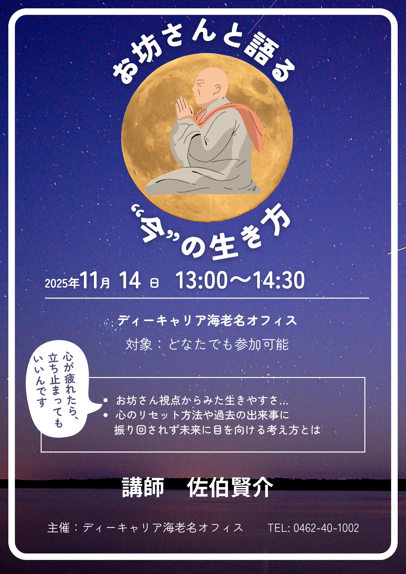 【ディーキャリア海老名オフィス】11月14日(金)開催「お坊さんと語る❝今の生き方」