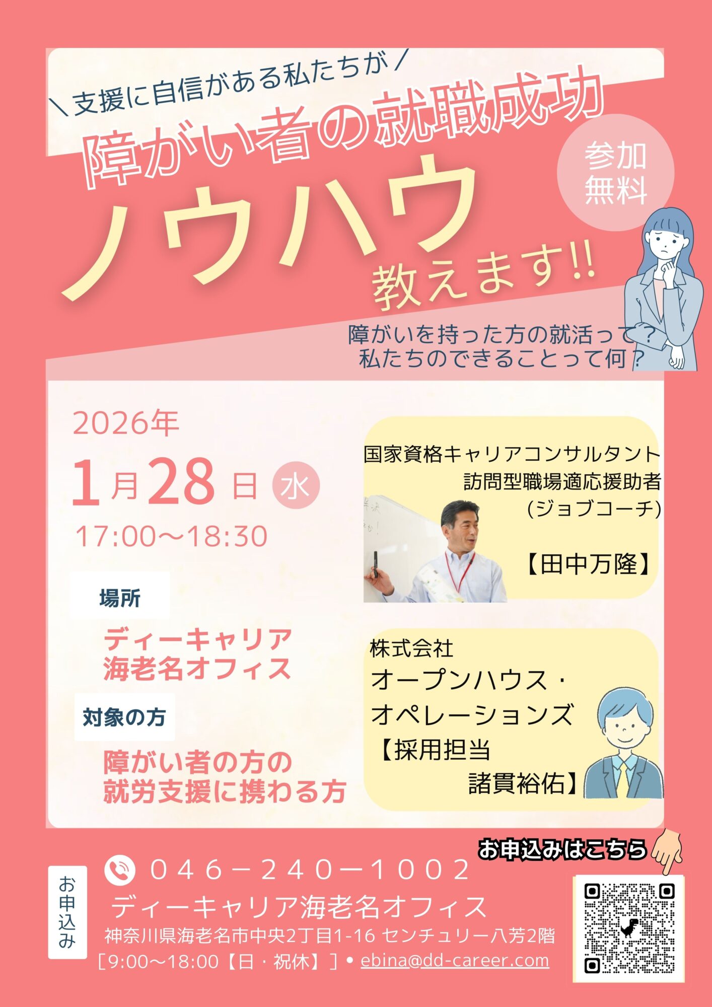 【ディーキャリア海老名オフィス】01月28日(水)開催「支援者・先生の方向け 障害者の就職成功ノウハウ教えます」