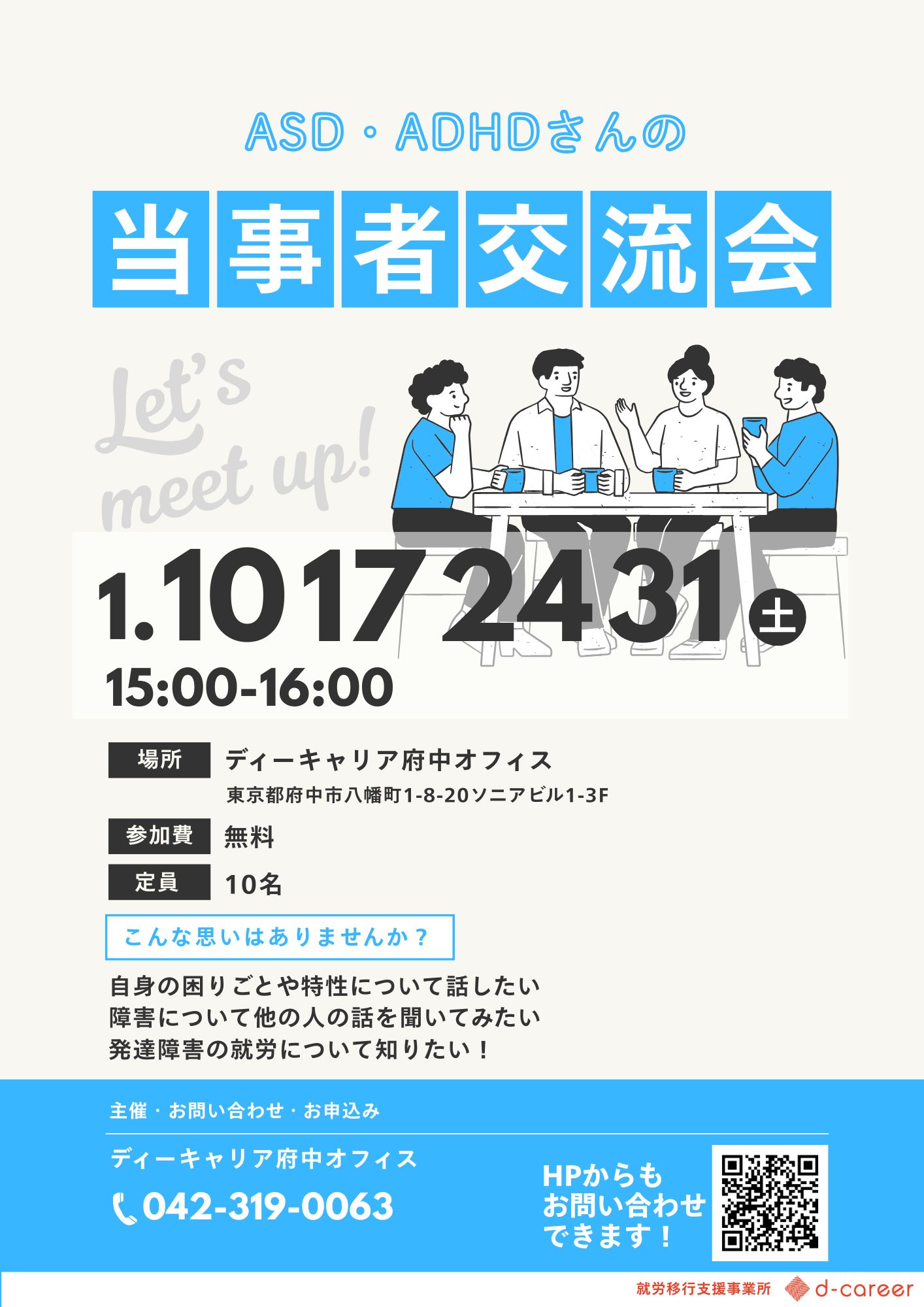 【ディーキャリア府中オフィス】01月毎週土曜日開催「ASD・ADHDさんの当事者交流会」