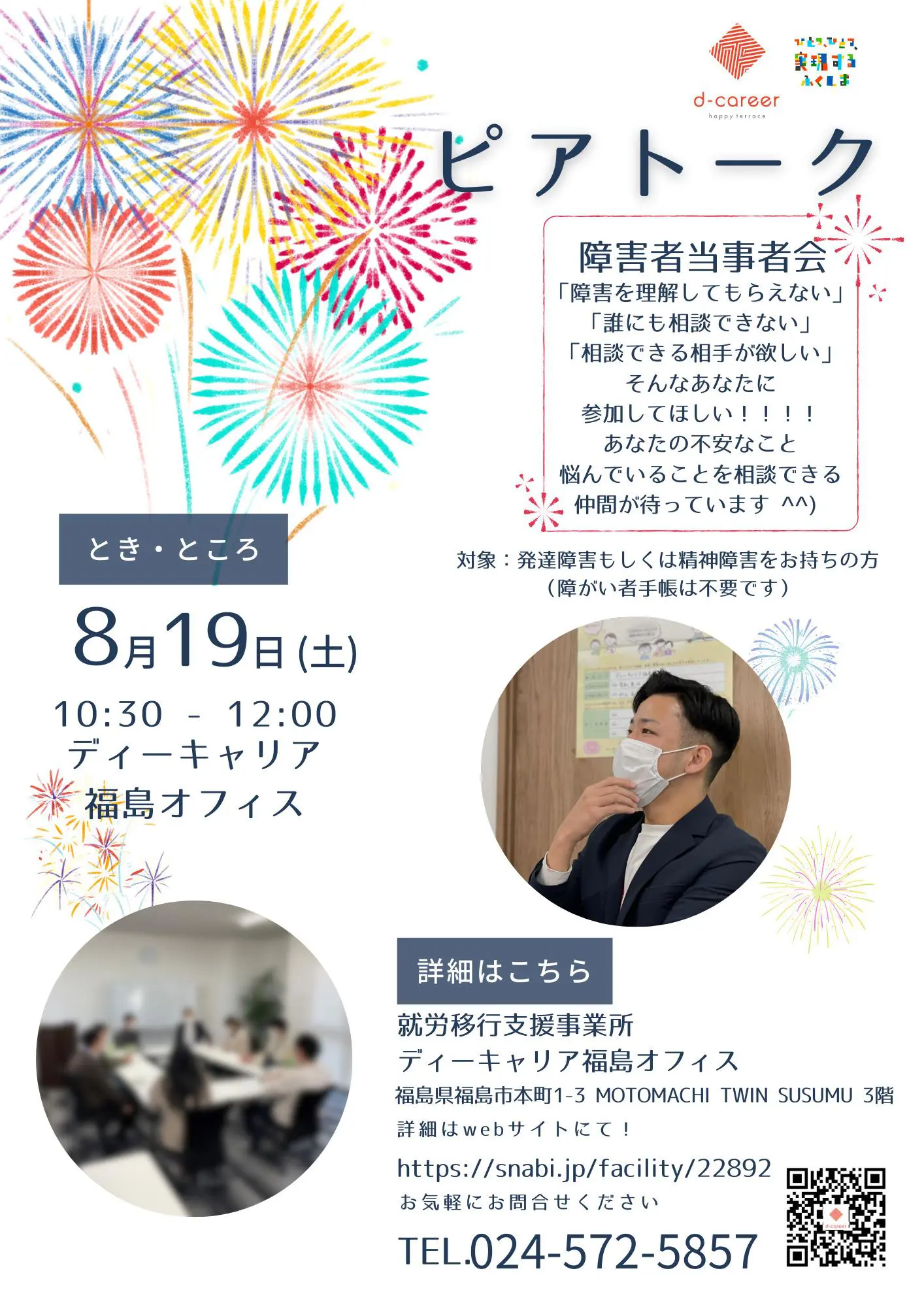 【ディーキャリア福島オフィス】8月19日(土)「障害当事者による座談会~ピアトーク~※参加費無料」