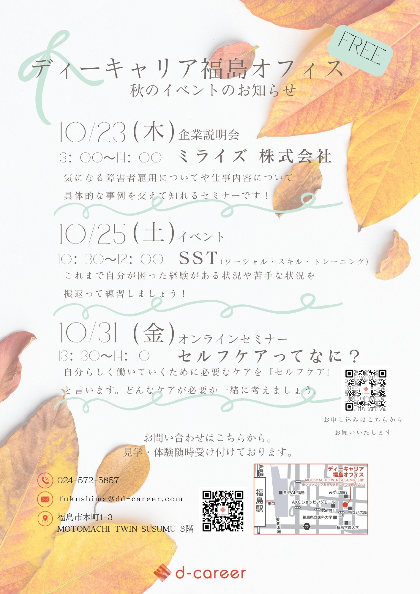 【ディーキャリア福島オフィス】10月23日(木)・25日(土)・31日(金)「10月のイベントのご案内♪」