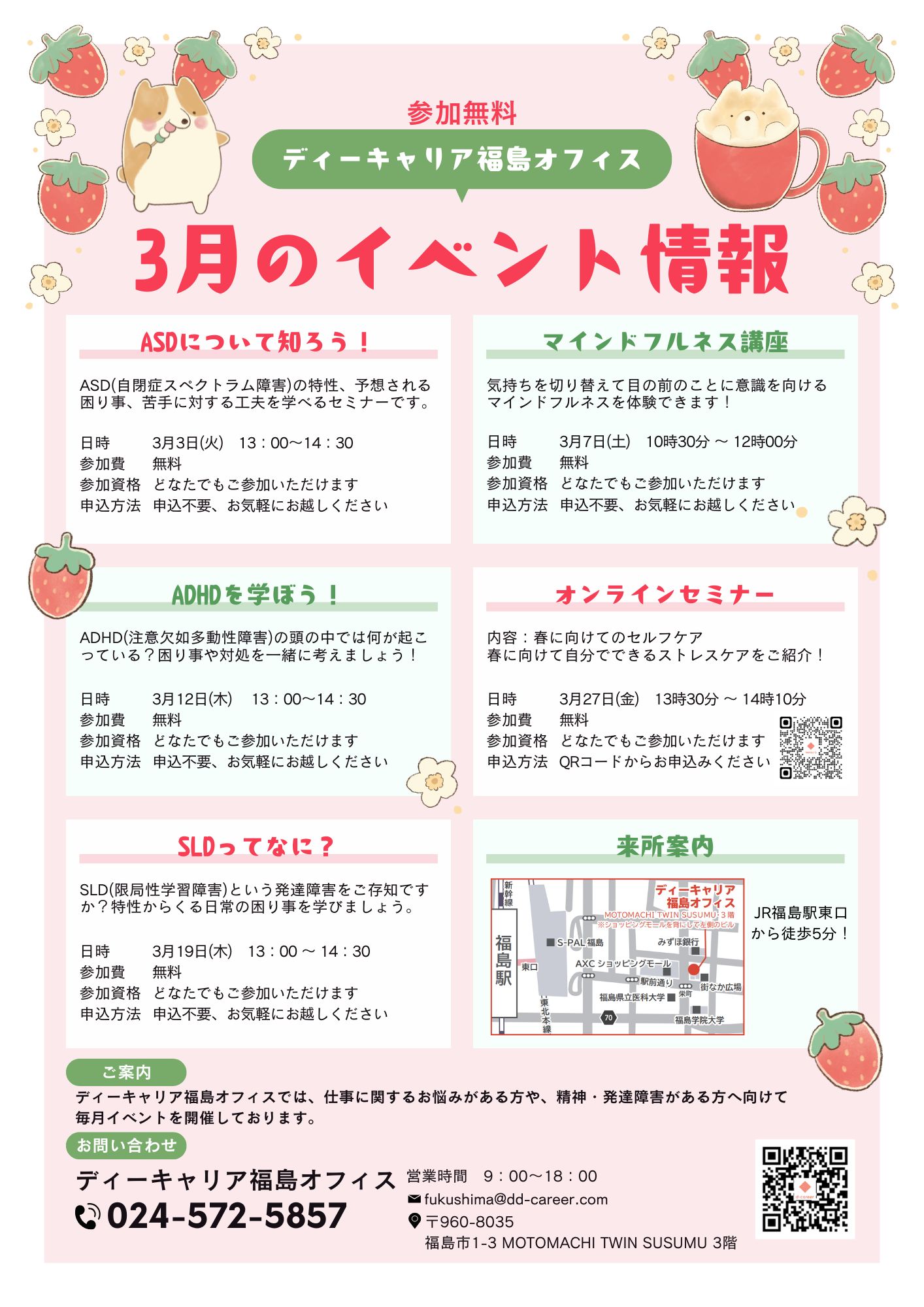 【ディーキャリア福島オフィス】03月03日(火)・07日(土)・12日(木)・19日(木)・27日(金)「3月のイベントのご案内(^^)/」