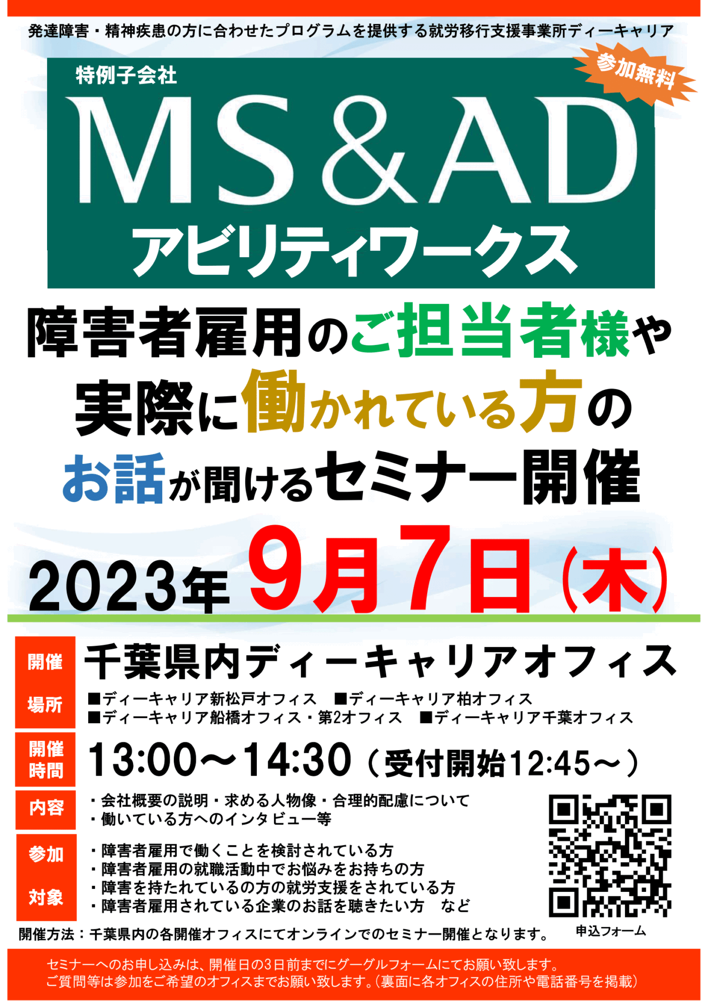 【ディーキャリア船橋オフィス】9月07日(木)「特例子会社MS&ADアビリティワークス登壇!!障害者雇用のご担当者様や、実際に働かれている方のお話が聞けるセミナー開催!!」