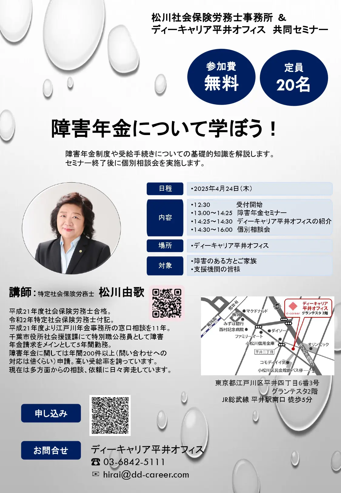 【ディーキャリア平井オフィス】4月24日(木)開催「「障害年金セミナー」のお知らせ」