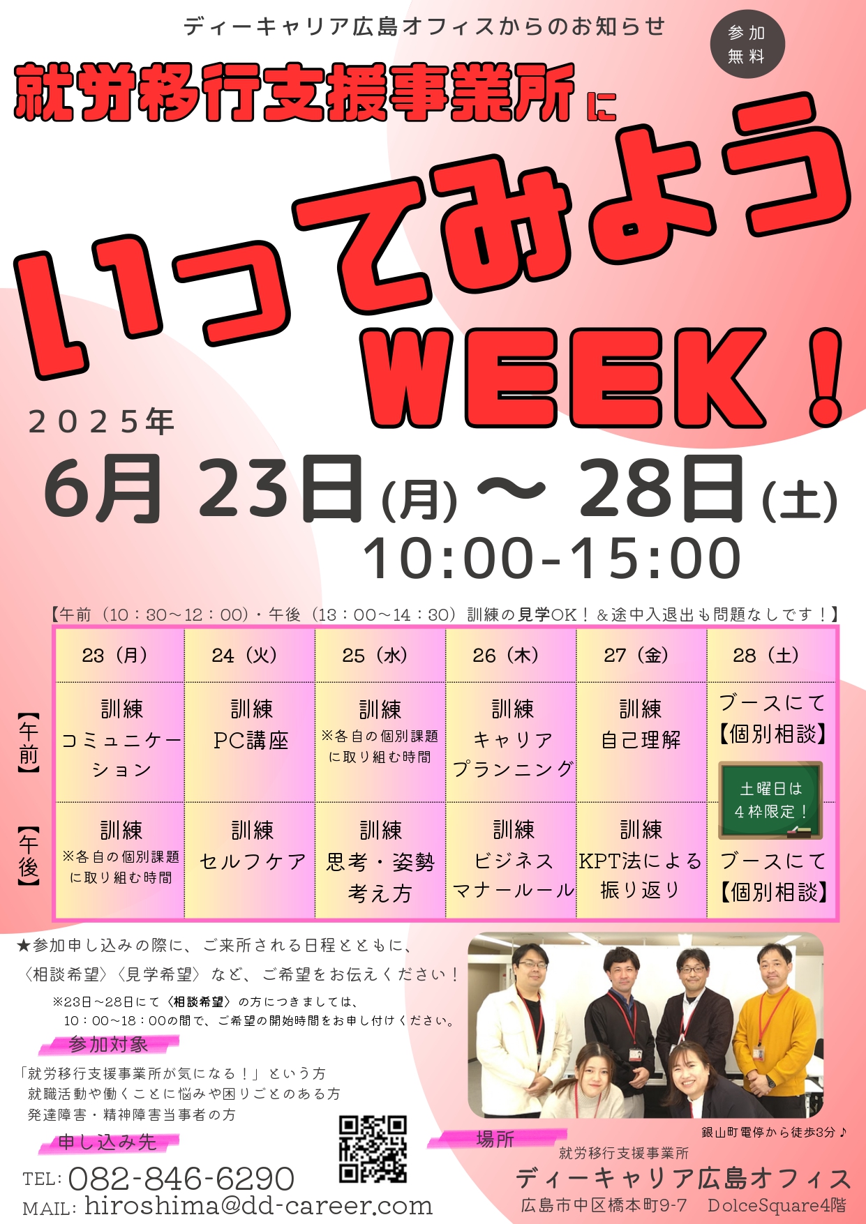 【ディーキャリア広島オフィス】6月23日(月)・24日(火)・25日(水)・26日(木)・27日(金)・28日(土)「就労移行支援事業所にいってみようWEEK!」