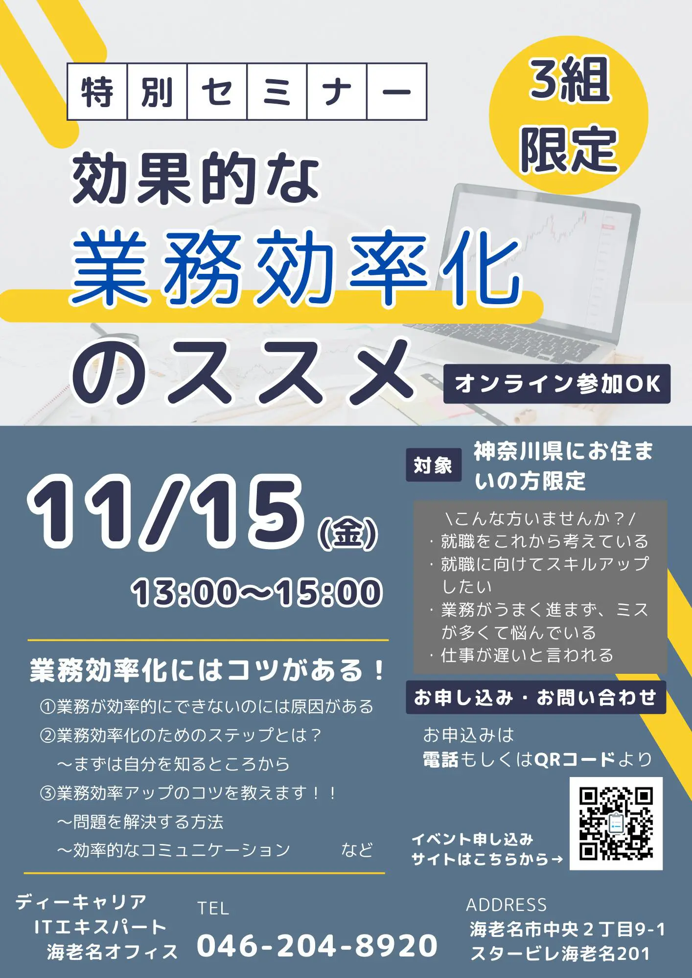 【ディーキャリアITエキスパート海老名オフィス】11月15日(金)「【神奈川県にお住まいの3組様限定!】業務効率化セミナー~効果的な業務効率化のススメ~」