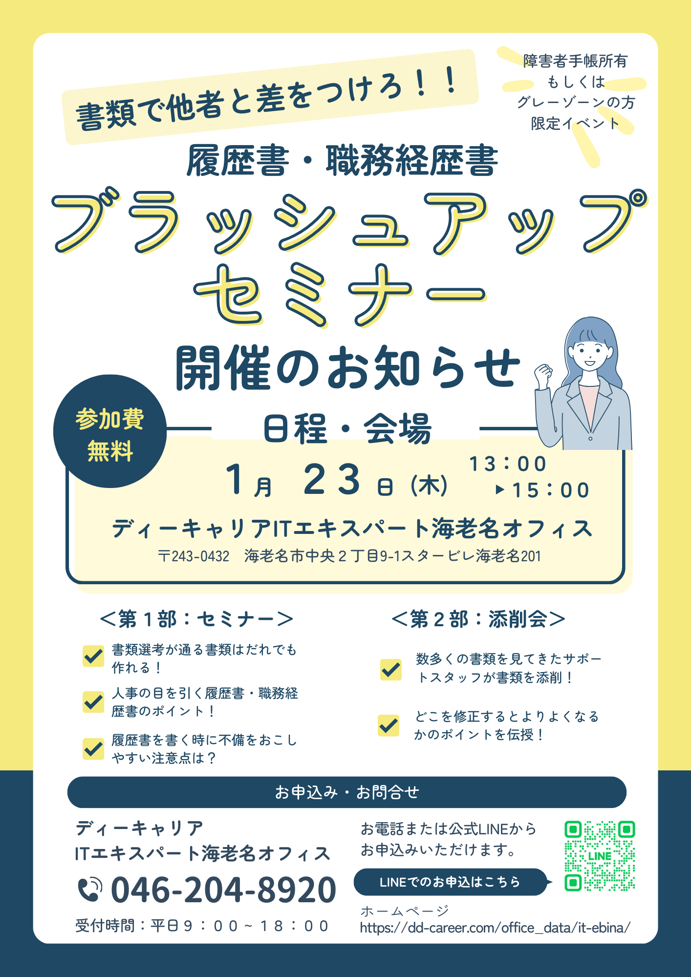 【ディーキャリアITエキスパート海老名オフィス】1月23日(木)「書類で他者と差をつけろ! 履歴書・職務経歴書ブラッシュアップセミナー」