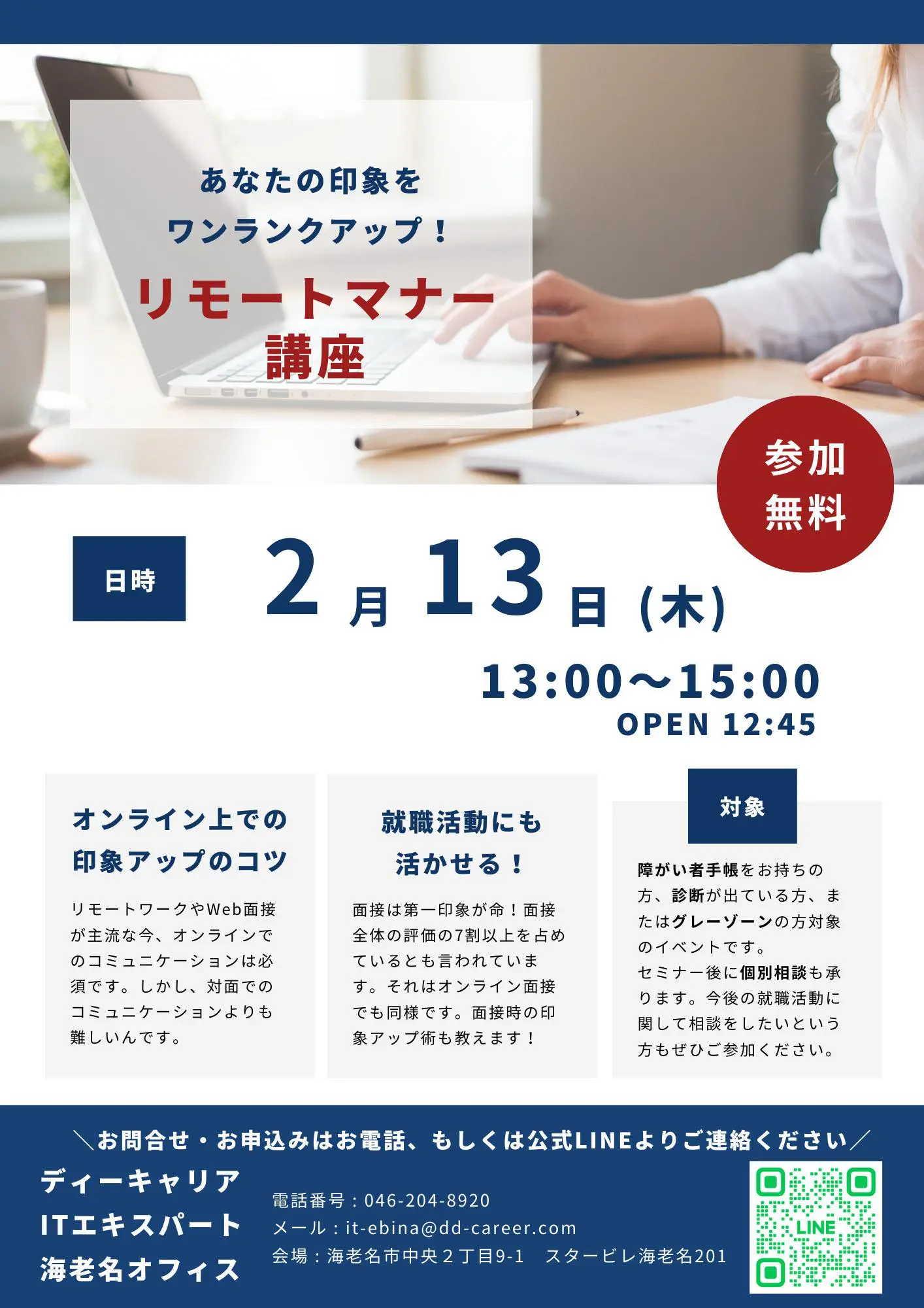 【ディーキャリアITエキスパート海老名オフィス】2月13日(木)「あなたの印象をワンランクアップ!リモートマナー講座」
