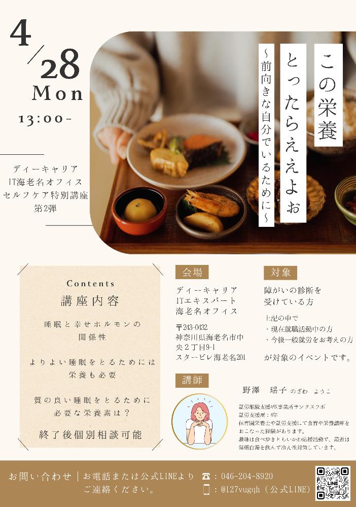 【ディーキャリアITエキスパート海老名オフィス】4月28日(月)「この栄養とったらええよぉ~前向きな自分でいるために~」