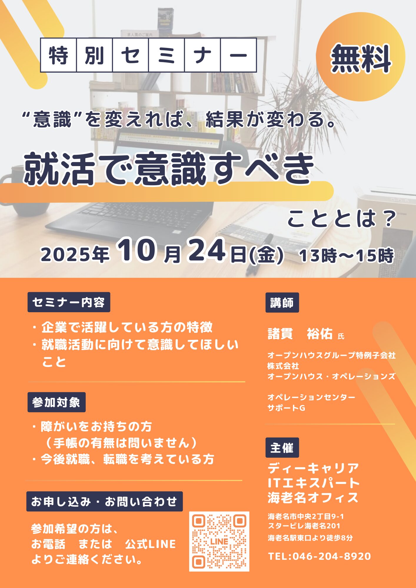 【ディーキャリアITエキスパート海老名オフィス】10月24日(金)「~特別セミナー~ ”意識”を変えれば、結果が変わる。就活で意識すべきこととは?」