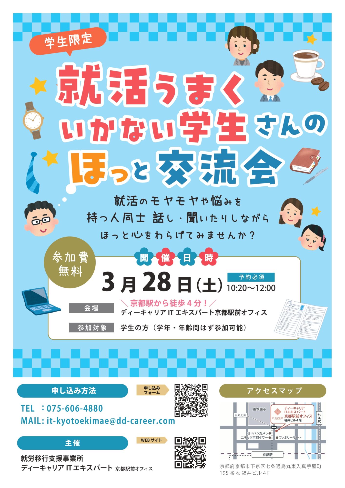 【ディーキャリアITエキスパート京都駅前オフィス】03月28日(土)開催「学生限定『就活うまくいかない学生さんのほっと交流会』」