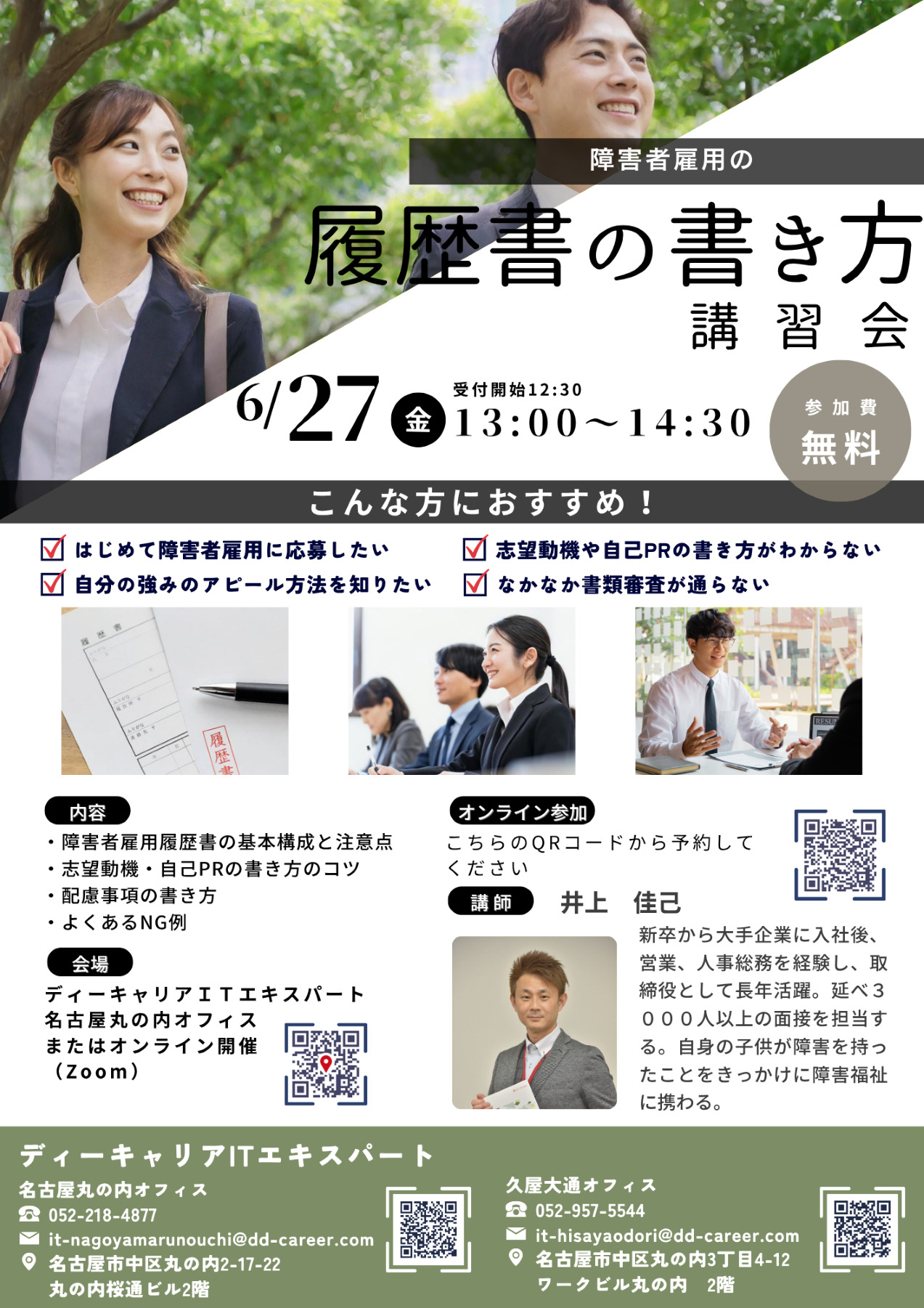 【ディーキャリアITエキスパート名古屋丸の内オフィス】6月27日(金)「障害者雇用 履歴書の書き方」