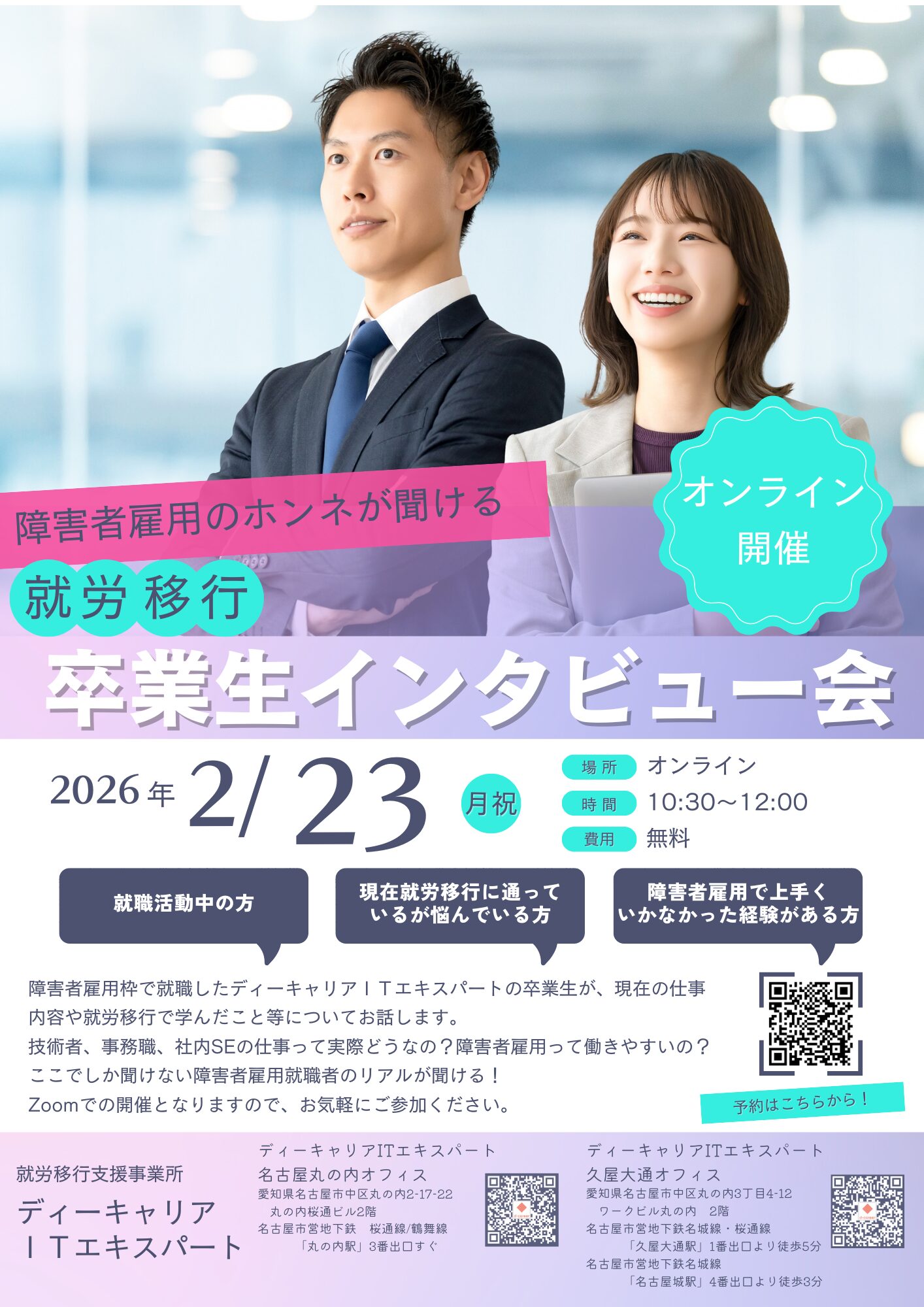 【ディーキャリアITエキスパート名古屋丸の内オフィス】02月23日(月)「【オンライン開催】就労移行 卒業生インタビュー会」