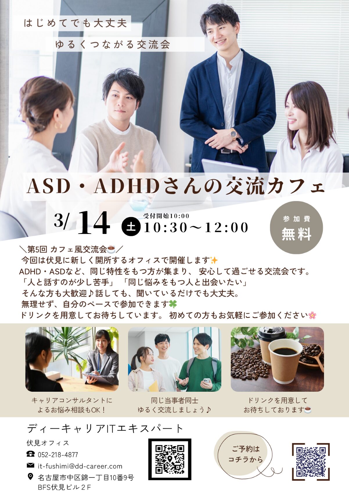 【ディーキャリアITエキスパート名古屋丸の内オフィス】3月14日(土)「ASD・ADHDさんの交流カフェ」