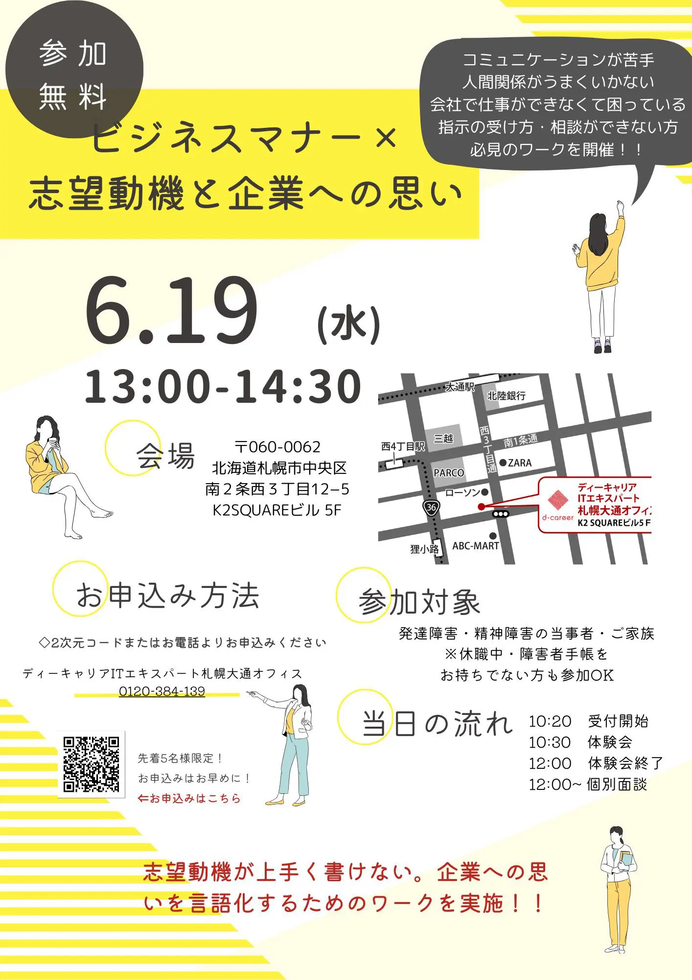 【ディーキャリアITエキスパート札幌大通オフィス 】6月19日(水)「発達障害×ビジネスマナー×志望動機と企業への思い」