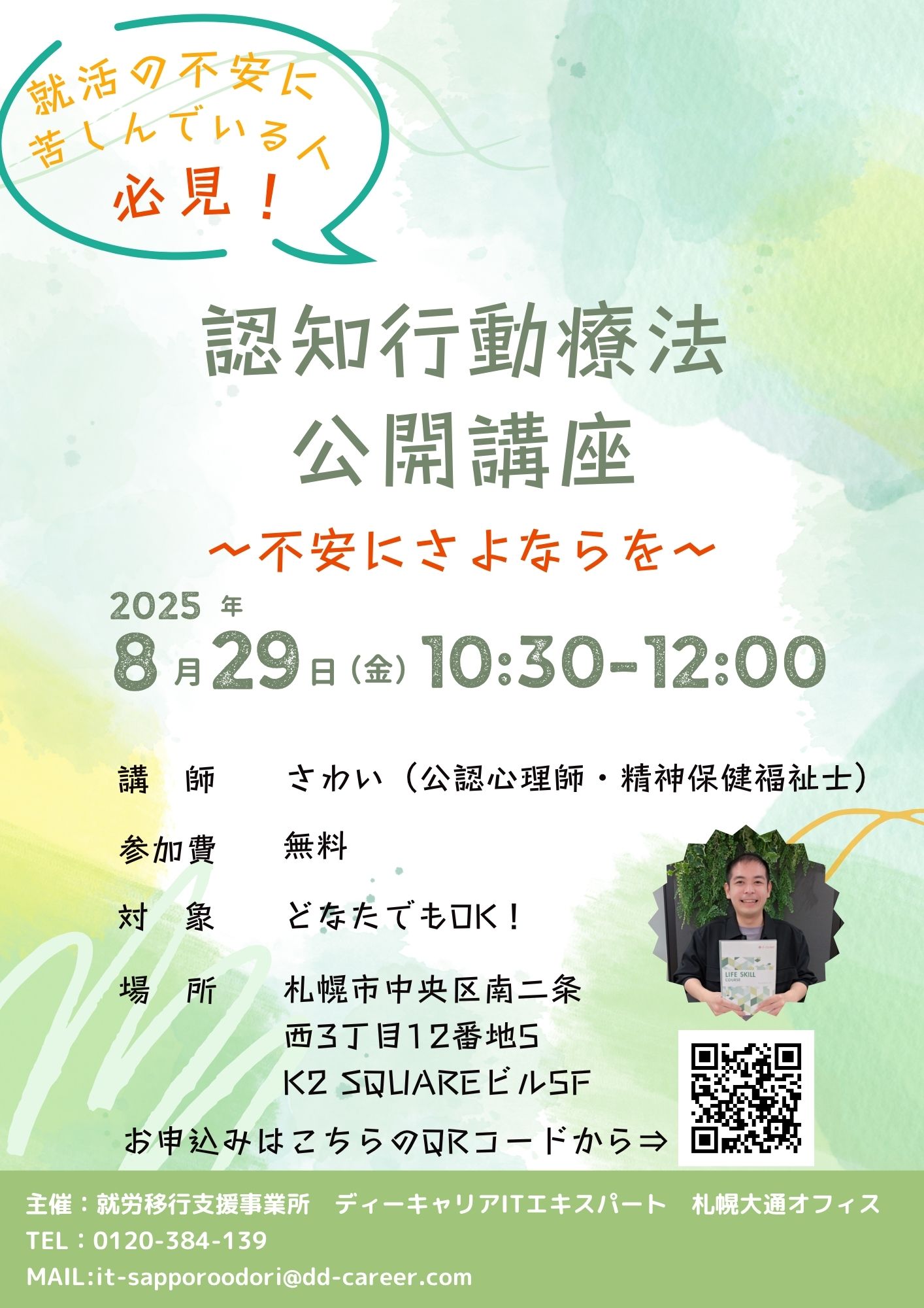 【ディーキャリアITエキスパート札幌大通オフィス 】8月29日(金)「就活の不安に苦しんでる人必見!公認心理師による『不安解消のための認知行動療法』講座!」